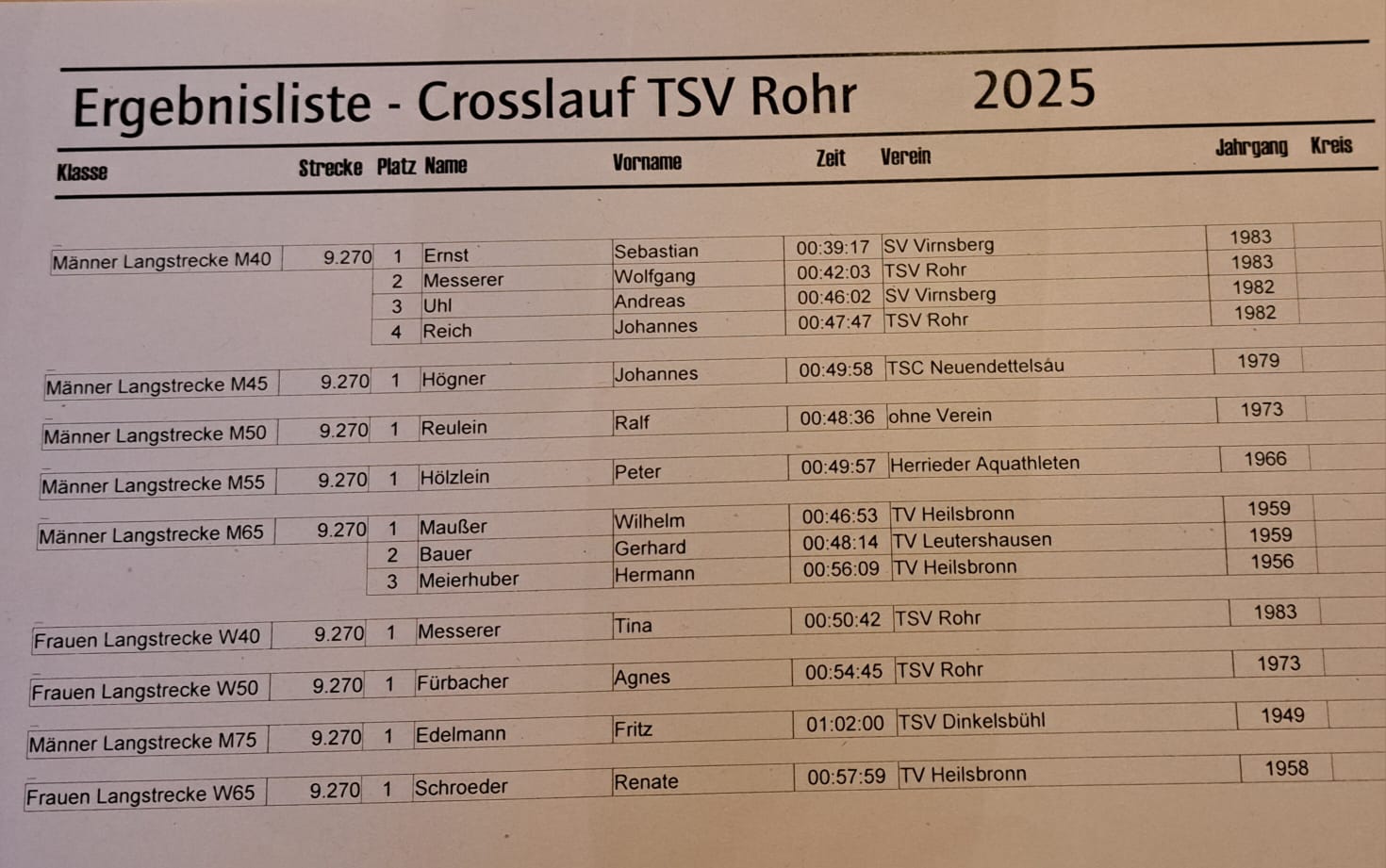 Zum Autakt der Crosslaufserie 2025 in Flachslanden über 7700m gab es beste Crosslaufbedingungen: Sonne, Regenschauer im Wechsel, Starkwind, stark durchnässte Passagen, das machte richtig Spaß. Wie schon im letzten Jahr konnte Gerhard Bauer die ersten 3 von 7 Runden mit Läuferfreund Wilhelm Maußer gut mithalten, dann zog er davon. Ins Ziel kam Gerhard in der Zeit von 40:48, (27 sec. schneller als 2024) auf Platz 2 in der AK 65.